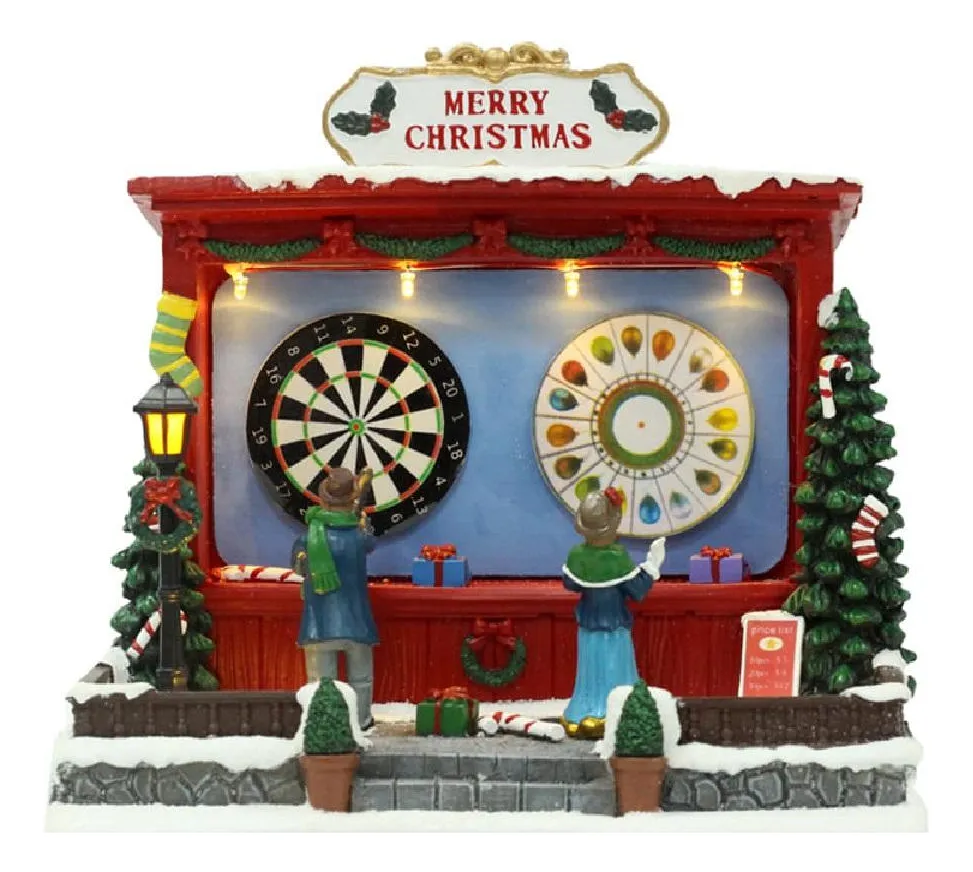 Essa peça detalhada recria um típico jogo de parque de diversões natalino, com dois personagens participando de um divertido tiro ao alvo sob uma charmosa barraca decorada com guirlandas, pinheiros e um letreiro “Merry Christmas”.